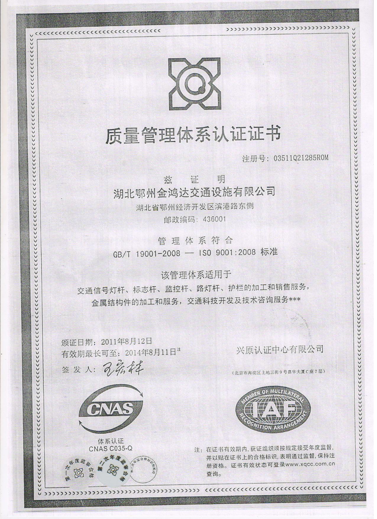 ISO9001:2008质量体系证书